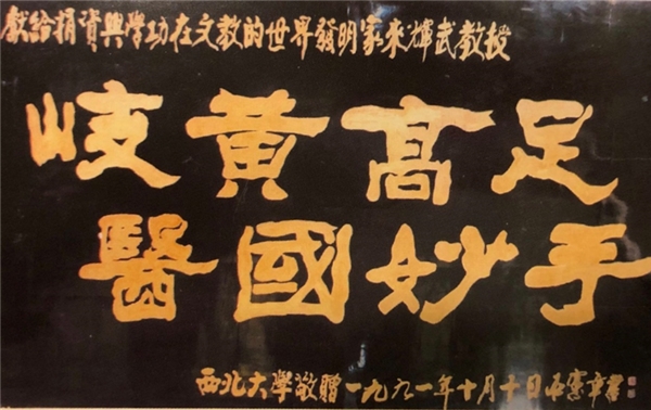 為了感謝來總裁對社會公益事業(yè)的巨大奉獻,西北大學(xué)校長及專家教授、教師,精心醞釀“岐黃高足,醫(yī)國妙手”,表達對505來總裁的崇高敬意,并請著名的書法家書寫后,雕刻成金字牌匾,專程鄭重向來總裁敬贈,并舉行隆重的贈匾儀式,會場內(nèi)外洋溢著熱烈喜慶的氣氛,匾額上“岐黃高足 醫(yī)國妙手”八個金黃色的大字格外醒目,各方來賓報以熱烈的掌聲,505的新老朋友、社會各界人士共同見證了這一難忘的時刻。