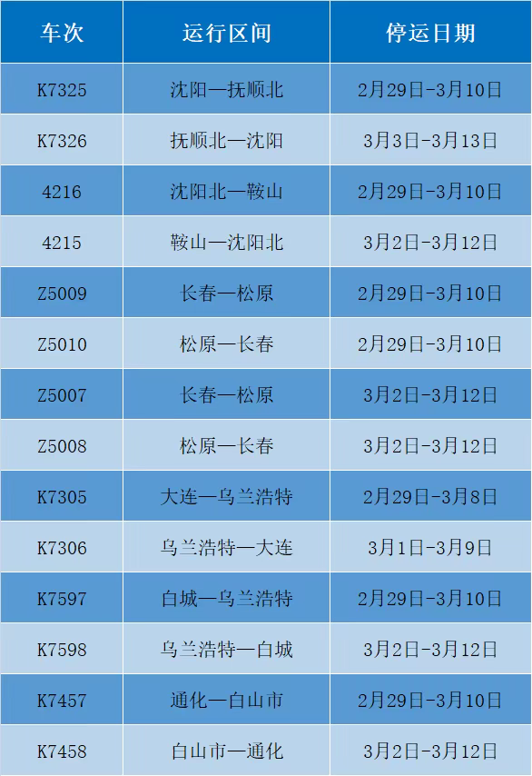 為應(yīng)對(duì)疫情防控,中國鐵路沈陽局集團(tuán)公司根據(jù)旅客出行需求變化,調(diào)整優(yōu)化列車開行方案,對(duì)部分旅客列車采取接續(xù)停運(yùn)措施,對(duì)66趟旅客列車接續(xù)停運(yùn)!